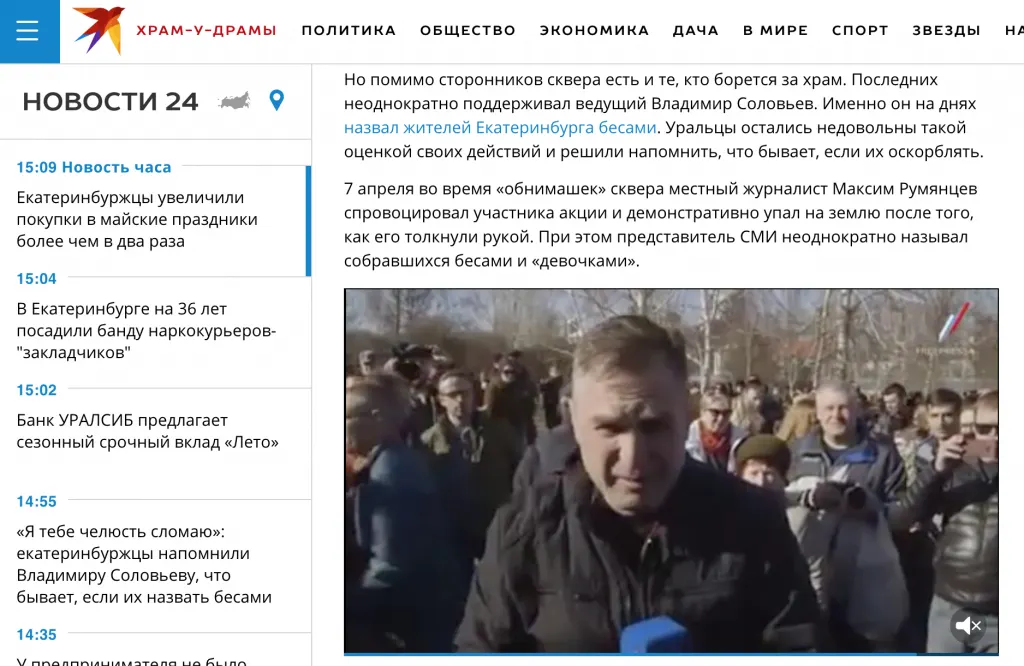 Местный журналист-патриот Максим Румянцев записывал видео с участниками протеста против строительства храма в центре Екатеринбурга. Мужчина назвал протестующих «бесноватами» и попросил одного из них дать комментарий по теме.