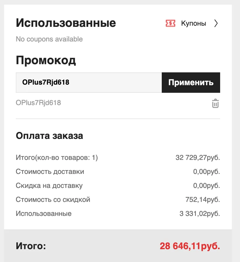 Китайский маркет продает OnePlus 7 (8/256 Гбайт) за 31 977 рублей – это средний прайс на рынке. Однако если на этапе оформления заказа ввести промокод OPlus7Rjd618, то цена снижается на 3 тысячи рублей. В итоге новейший флагман можно взять всего за 28 646 рублей!