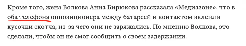 Жена Волкова Анна Бирюкова рассказала «Медиазоне», что полицейские вклеили кусочки скотча между батареей и контактами на оба телефона Лео. Из-за этого аппараты не заряжались, а Волков не смог сообщить о задержании.