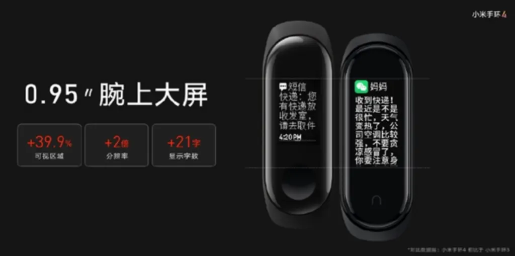 Браслет получил примерно тот же форм-фактор, что и Mi Band 3, однако экран стал более плоским на вид. Также дисплей увеличился на 39,9%, из-за чего, например, может уместить примерно на две строки или на 20 слов больше.