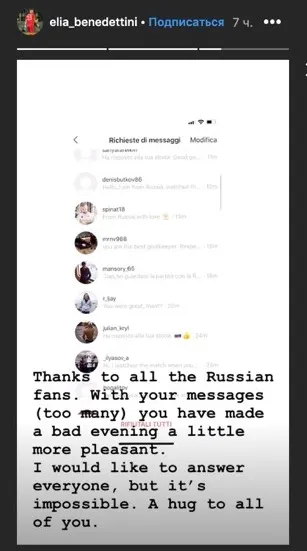 Видимо, какое-то время комменты под постами Бенедеттини были закрыты (или сам Элиа прикрыл их от набега фанатов), поэтому русские люди начали писать ему прямо в директ. Сейчас оставлять комментарии можно под любым постом.