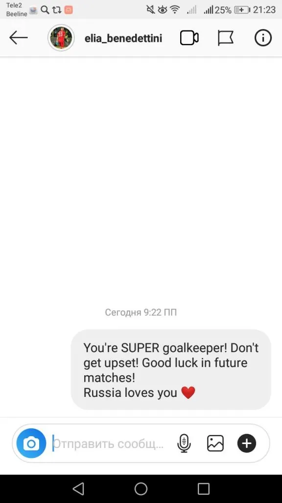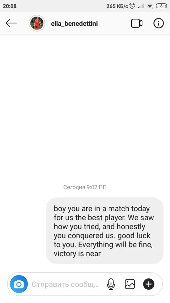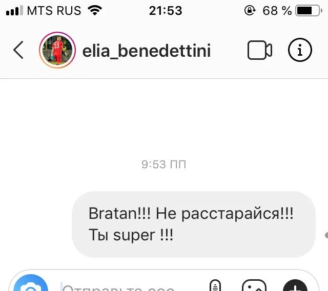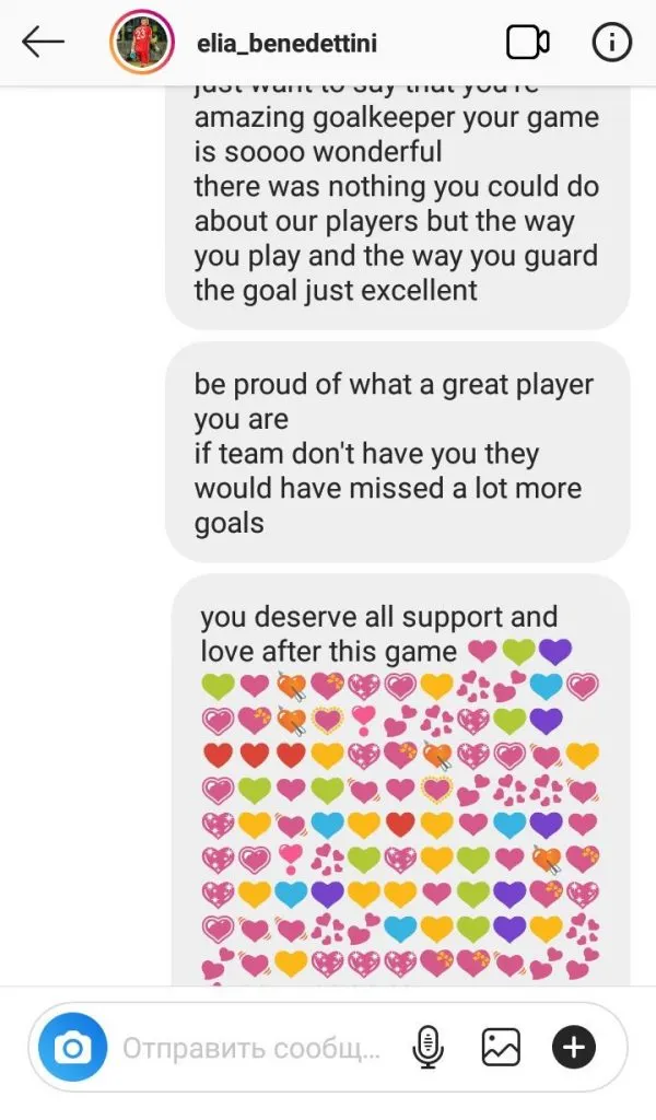 Многие боялись, что вратарь может воспринять поддержку за стеб и закрыться, но все оказалось куда лучше. Элиа выложил сториз, в котором от души поблагодарил всех комментаторов. «Ваши сообщения (очень много) сделали плохой вечер чуточку радостней. Хотел бы ответить каждому, но это невозможно», – заметил Бенедеттини.
