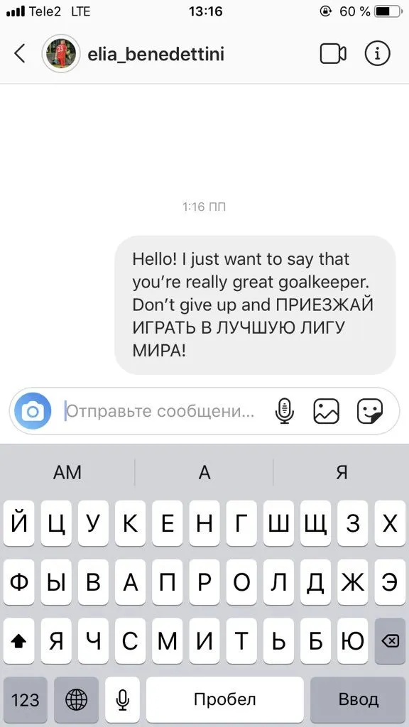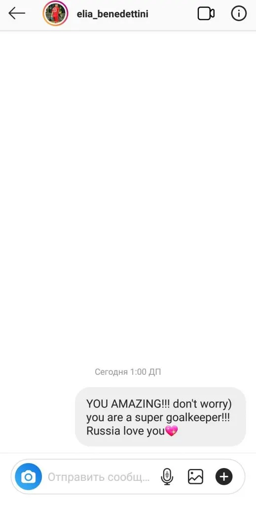 Но это не главное. Пользователю Twitter @vlagklss стало жалко вратаря проигравшей команды Элиа Бенедеттини, которому закинули девять безответных плюх. Чтобы поднять самооценку 23-летнего парня, @vlagklss нашел Элиа в Instagram и предложил поддержать кипера.