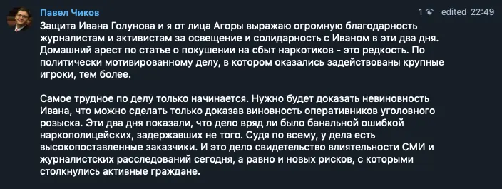 О домашнем аресте просила защита Голунова. Прокурор требовал заключения под стражу на два месяца. Суд запретил Ивану общаться с фигурантами дела и пользоваться средствами связи (читай, телефоном и интернетом).