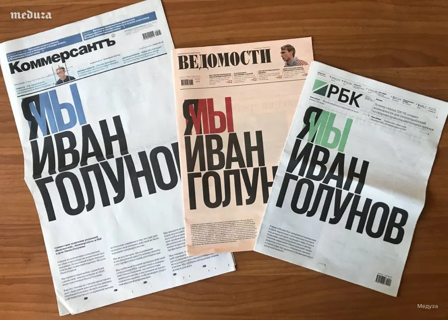 Историческое событие – сегодня три ведущие деловые газеты страны вышли с одинаковой обложкой. «Ведомости», РБК и «Коммерсант» поместили на первую полосу заг в поддержку задержанного корреспондента Meduza Ивана Голунова.