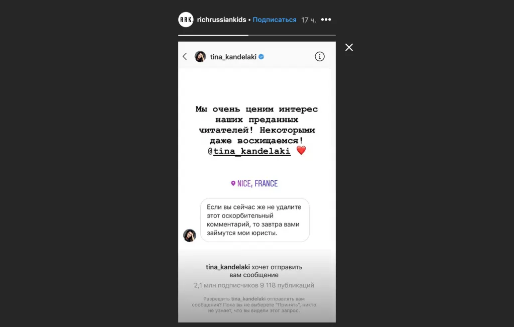 Спустя некоторое время RRK выложил сториз со скриншотом сообщения от матери девочки – Тине не понравился дерзкий комментарий. По информации «Беспощадного пиарщика», пост был удален, но затем восстановлен, а в сториз появился скириншот сообщения от Канделаки.