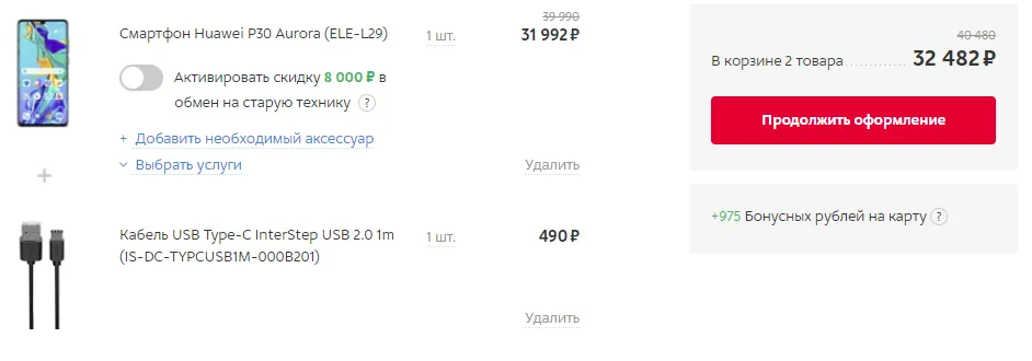 Правда, для участия в акции надо выполнить одно условие: к смартфону необходимо докупить любой аксессуар на сумму от 490 рублей. Добавляйте девайс и, к примеру, любой зарядный кабель в корзину – скидка активируется автоматически, остаётся только оплатить.