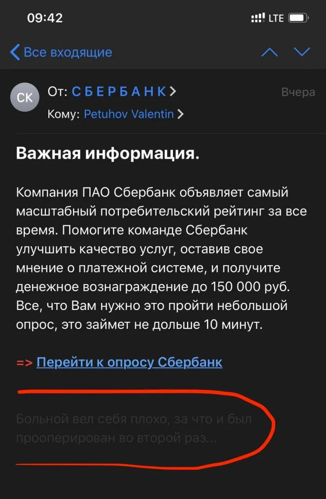 Все признаки развода налицо – мутный адрес почты отправителя, название банка через пробелы, чтобы не спалил спам-фильтр, якобы ожидающая адресата премия за прохождение опроса. Но если посмотреть на письмо в режиме темной темы, снизу вылезет подпись. Или пасхалка? Или намек?