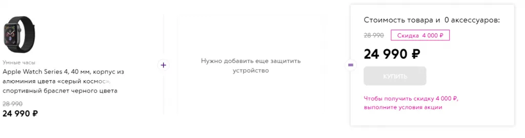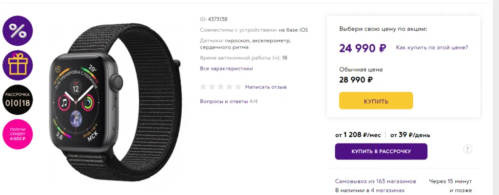 Сегодня в поиске интересных скидонов мы случайно наткнулись на акционный товар в «Связном»: магазин предлагает умные часы Apple Watch S4 якобы за 24 990 рублей вместо изначальных 32к. Именно 32 тысячи, как видно на втором скрине — такой же ценник выставлен и у других ритейлеров вроде re:store или МТС
