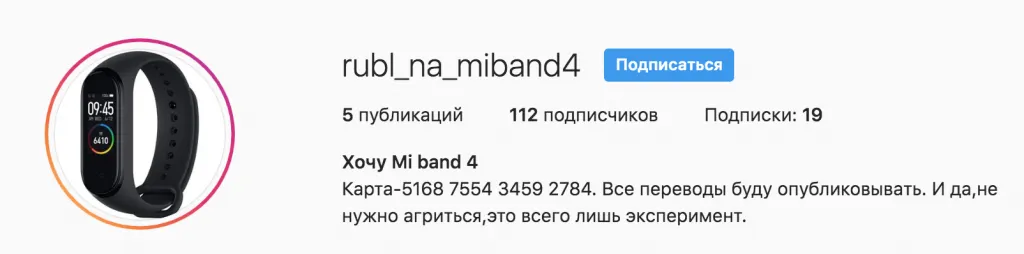 В инстаграме появился аккаунт молодого человека из Украины, который якобы проводит эксперимент, собирая деньги на Xiaomi Mi Band 4.