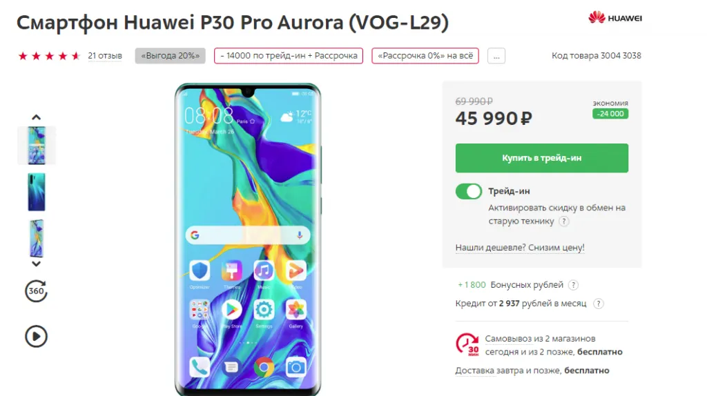 Вот только стартовая цена подкачала — аж 70 тысяч рублей в официальных магазинах. Но прошло несколько месяцев, и смарт ожидаемо упал в цене: в «М.Видео» его можно приобрести за 45 990 рублей по программе «Trade-in». В чём суть акции?