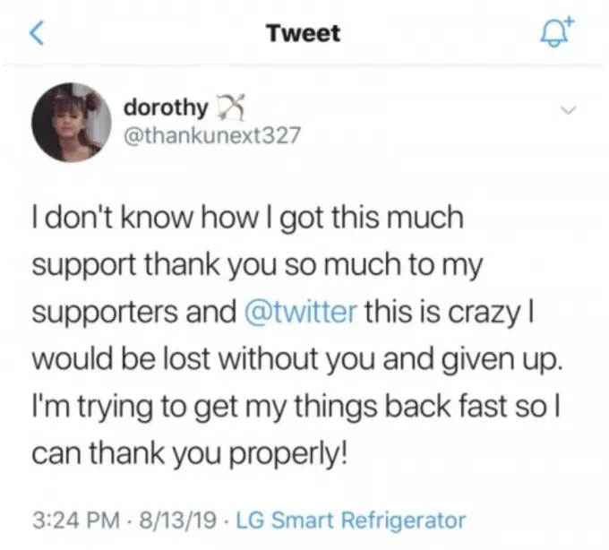 История стала вирусной и тогда Дороти написала свой первый твит с холодильника LG. Она рассказала, что в тайне от родителей зашла в браузер на умном холодильнике и отправляет твиты оттуда, с помощью голосового набора.