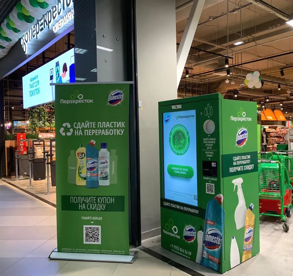 X5 Retail Group (сети «Пятерочка», «Перекресток», «Карусель») вместе с компанией Unilever установили автоматы по сбору бутылок в московских гипермаркетах. За каждую сданную тару будет выдаваться купон на скидку в магазине.