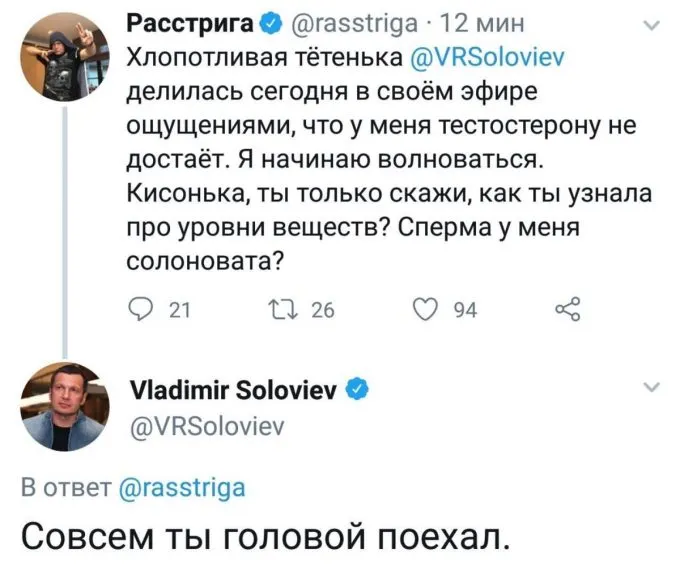 Соловьева не тронула порка Михалкова, фейл с Киселевым или фильм про Колыму – только Сергею Доренко он ответил через твиттер, но не задел Дудя. Снова на Юрия Владимир напрыгнул после призыва блогера выходить на митинг в Москве. В телеграм-канале пропагандист прицепился к словам «граждан России бьют шпалами по лицу», а затем порадовался фейковому видео с тренировкой якобы Юрца с грушей.