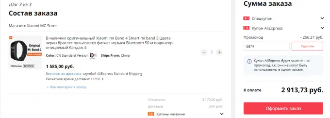 Но есть и ещё один повод для покупки устройства на Али. Объясняем: если вы заказываете сразу пару Mi Band 4, то тоже можно неплохо сэкономить. Надо всего-то ввести промокод GET4 при оформлении заказа и выйдет итоговый прайс в 2913 рублей. Напоминаем: у официалов даже один экземпляр (2990 рублей) обойдется дороже двух из Китая.