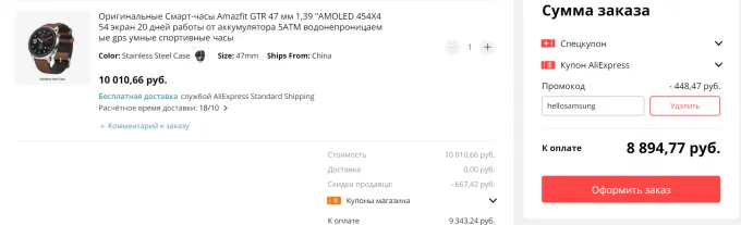 А теперь расскажем о хитрости, которая позволит вам урвать Amazfit GTR за те самые 8894 рубля. Для этого сначала надо взять купон продавца прямо на странице товара, а уже потом при оформлении заказа вбить промокод hellosamsung. Профит!