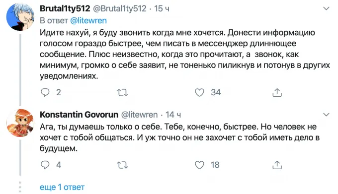 Вирус, судя по всему, пошел с твита известного гейм-журналиста Константина Говоруна, который предложил твиттеру ознакомиться с сетевым этикетом. Говорун процитировал выдержки с канала «Патюлина имеет сказать», автор которого объяснил, почему звонить в 2019 году – плохо.