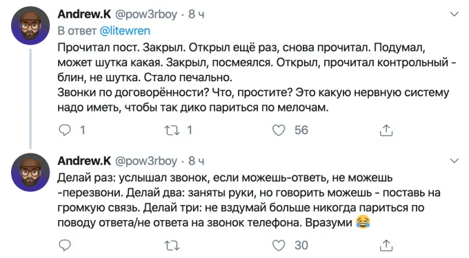 Русский Twitter обсуждает, корректно ли с точки зрения этикета звонить. Сторонники тишины кричат о вмешательстве в личное пространство, а спокойно относящиеся к звонкам люди иронизируют над изнеженными миллениалами.