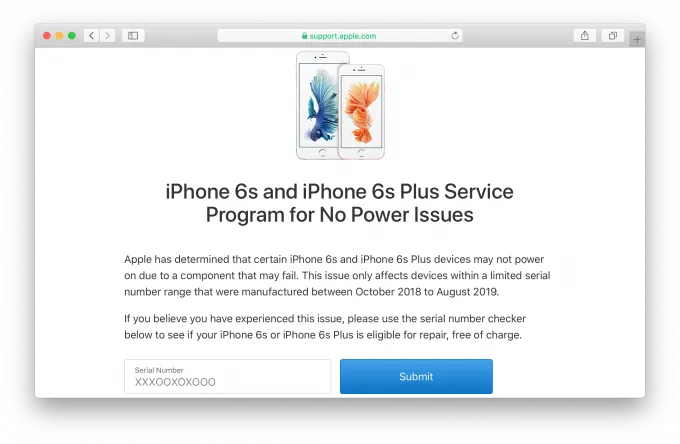 Компания не объясняет, в чем именно проблема, но дает понять, что дефективные устройства были выпущены в период с октября 2018 года по август 2019 года. Если за последний год вы приобретали новый 6s или 6s Plus, проверьте свой аппарат, введя его серийный номер на сервисной странице.