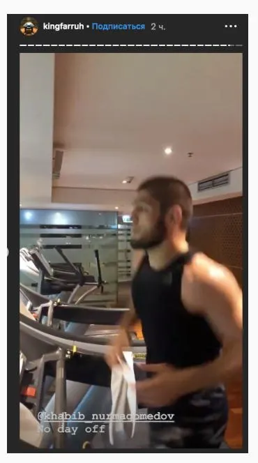 Также любопытно, что вместе с Хабибом с мероприятия ретировался и его друг Фаррух; он же через пару часов выложил Нурмагомедова у себя в сторис – но не в Кремле, а на беговой дорожке. Возможно, это были старые кадры, а возможно, Хабиб просто пренебрег прессой и побежал заниматься в зал.