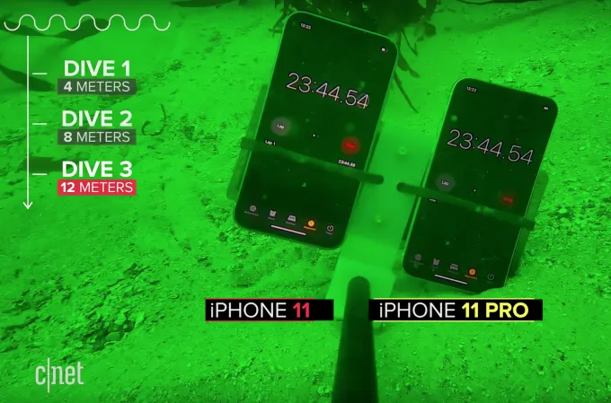 Согласно документации, iPhone 11 может находиться на глубине до двух метров длительностью не более получаса, для 11 Pro и 11 Pro Max этот показатель увеличен до четырёх метров. Важно заметить, что тесты Apple проводились в пресной воде, тогда как издание CNet топило девайсы в океане.