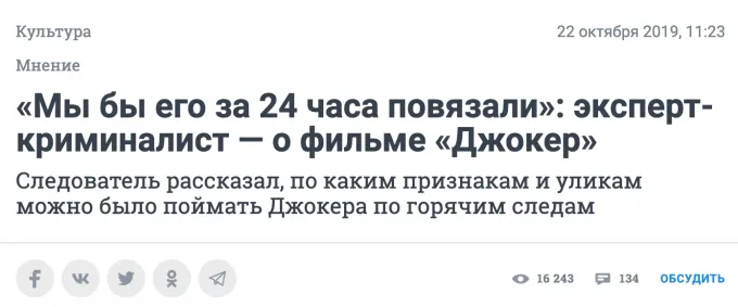 Один из главных мемов дня – история про Джокера и новосибирского следователя. Сотрудник полиции заявил, что в фильме про поехавшего комика Артура Флека есть множество ляпов и что в реальном мире клоуна с пистолетом быстро бы поймали.