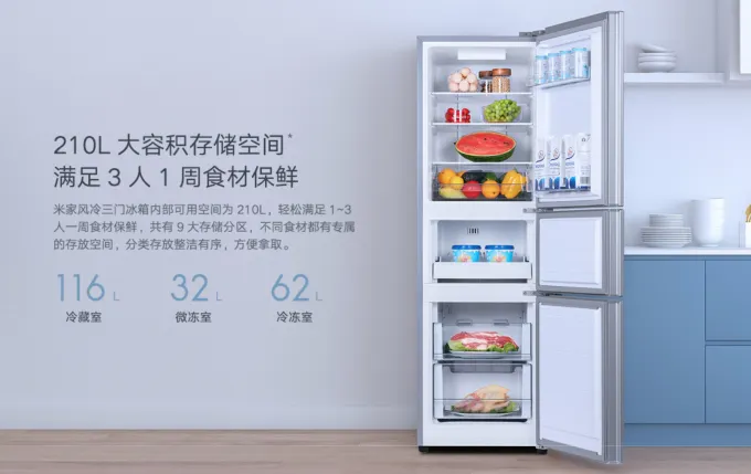 Линейка начинается с холодильника на 160 л (отсек на 100 л и две морозильные камеры на 40 и 20 л), высота прибора составляет 149 см. Малыш стоит 999 юаней или около 9 тысяч рублей. Следующая модель имеет объем 210 л, его высота составляет 171 см, продукты можно раскидать по трем отделениям (у всех есть своя дверца).