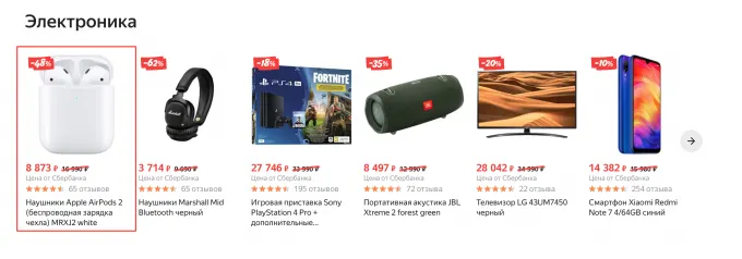 Четвёртый шаг: в разделе «Электроника» находим заветные «ушки» и добавляем товар в корзину. Перед оформлением покупки заходим сюда и забираем купон на скидку 500 рублей.