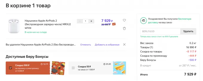 Пятый шаг: активируем купон в корзине, затем вводим промокод BERU1GOD. Если вы всё сделали правильно, то сможете заказать наушники всего за 7929 рублей.
