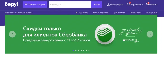 Третий шаг: браузер откроет страницу маркетплейса. Логинимся и находим на главной баннер с надписью «Зелёный день» – кликаем. Важно: если пропустить первый и второй шаги, то баннер не появится.