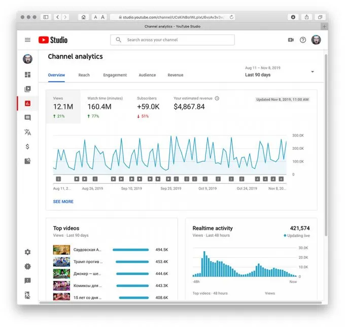 Судя по статистике, самый популярный видос за 90 дней на канале дизайнера собрал 494К просмотров, блог получил 1,7 млн уникальных зрителей, а каждый юзер даёт блогеру 7,2 просмотра. К сожалению, Тёма не раскрыл самую интересную вкладку – Revenue («Доход»).