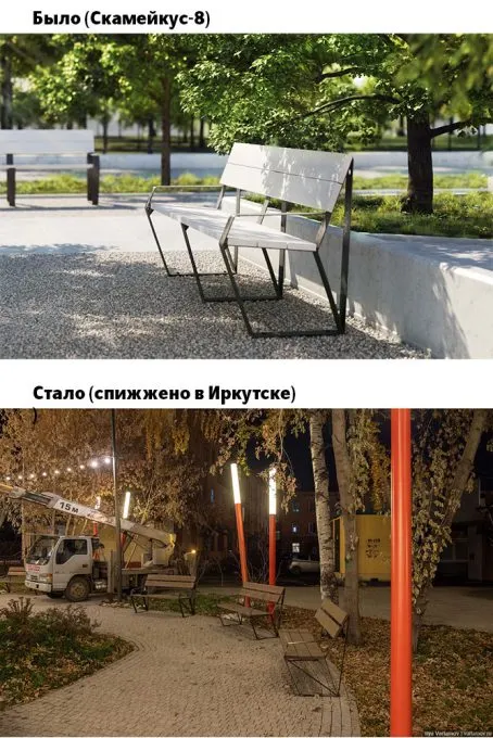 Тёма приложил фото нового сквера на пересечении улиц Сурикова и Чудотворской. По его словам, воровство очевидно – «иркутяне решили не заморачиваться покупкой прав или лицензий, а просто тупо ******** [украли] наш дизайн».