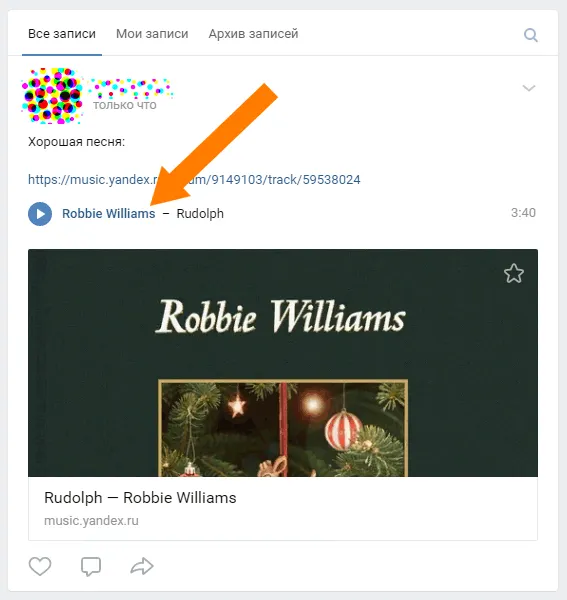 Если вставить в пост VK ссылку на трек из «Яндекс.Музыки», алгоритм найдёт аналогичную композицию в библиотеке «ВКонтакте» и прикрепит её к записи.