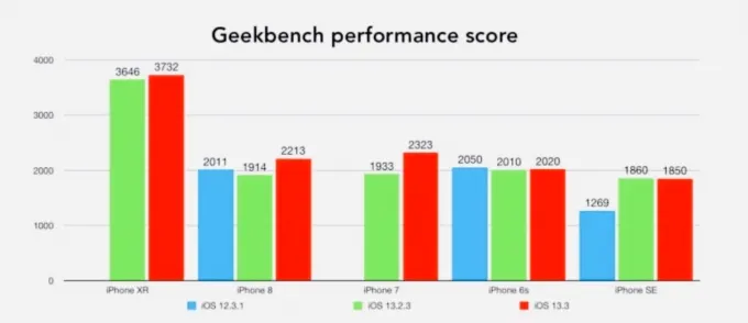Свежайшую iOS 13.3 накатили на аппараты прошлых поколений – iPhone XR, 8, 7, 6s, SE. Практически во всех случаях девайсы показали рост производительности. Особенно отличились iPhone 7 и 8, а вот скорость работы 6s не сильно возросла (производительность SE даже чуточку снизилась).