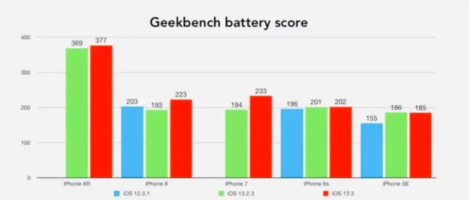 Далее аппараты прогнали через тест автономности Geekbench. Обновление как минимум не снизило время работы от батареи, а в случае iPhone XR, 8 и 7 автономность даже выросла.