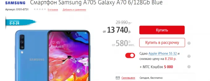 Если хотите дополнительно сэкономить, то можно взять смартфон в МТС по программе «Trade-in»: при сдаче старого гаджета вам полагается не только скидка за сдаваемый аппарат, но и дополнительный скидон в 7 тысяч рублей. Например, если сдать старенький iPhone 5S, то Galaxy A70 обойдётся вам всего в 13 740 рублей.