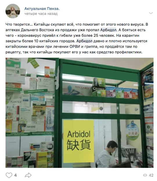 На самом деле, ФАС нужно проверить ещё и рекламу сомнительных препаратов на местах. Например, из пабликов VK можно узнать, что некоторые аптеки дополнительно стимулируют продажи гомеопатии кустарной рекламой. «Китайцы скупают всё, что помогает от этого нового вируса», – пишет анонимный пользователь сообщества «Актуальная Пенза».