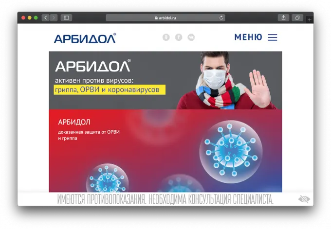 Ранее «Открытые медиа» заметили, что реклама «Ингавирина», который производит «Валента Фарм», вылезает при запросе «чем лечить коронавирус» в Google. На сайте «Арбидола», например, прямым текстом указано, что лекарство «активно» против гриппа, ОРВИ и коронавирусов.