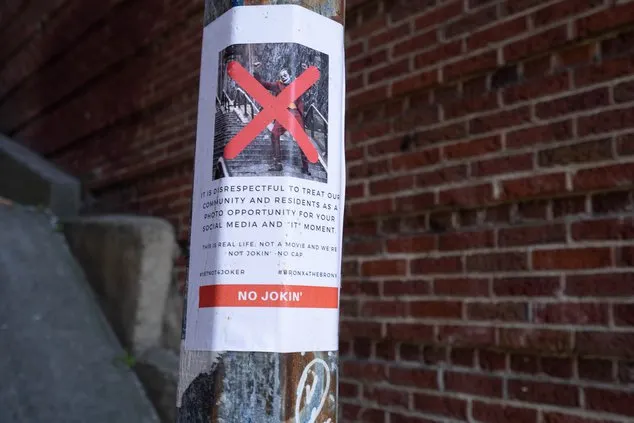 Дело в том, что именно там находится лестница, по которой спускался Джокер в одной из самых запоминающихся сцен фильма. Теперь это место осадили туристы-косплееры, чтобы наделать фоток в стиле постера или снять меметичное видео. Местные жители оказались совсем не в восторге от такой популярности. Например, возле лестницы повесили вот такую табличку.