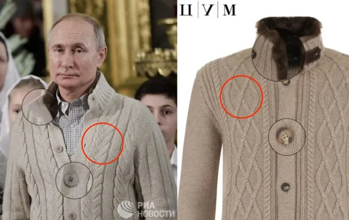 Если приглядеться, то можно заметить, что президентский свитер и кардиган из ЦУМа – совершенно разные лоты. Обратите внимание хотя бы на оттенок пряжи, узор, цвет пуговиц и подбой на воротнике.