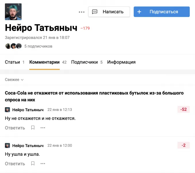 Мемная фраза настолько удачно ушла в народ, что на популярном сайте TJournal создали бота. Нейро Татьяныч бегал по комментариям, подсасывал глаголы из заголовка и спамил. Бота не любили и минусовали.