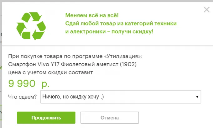 Самое интересное — способ получения скидки. Формально «Эльдорадо» обещает скинуть 2 тысячи рублей при сдаче старой техники по акции «Утилизация». На практике всё куда проще: если в виртуальной корзине поставить галочку напротив пункта «Хочу получить скидку по утилизации», то следом выползет окошко в котором спросят, что вы собираетесь сдавать. Там же выбираем вариант «Ничего, но скидку хочу».