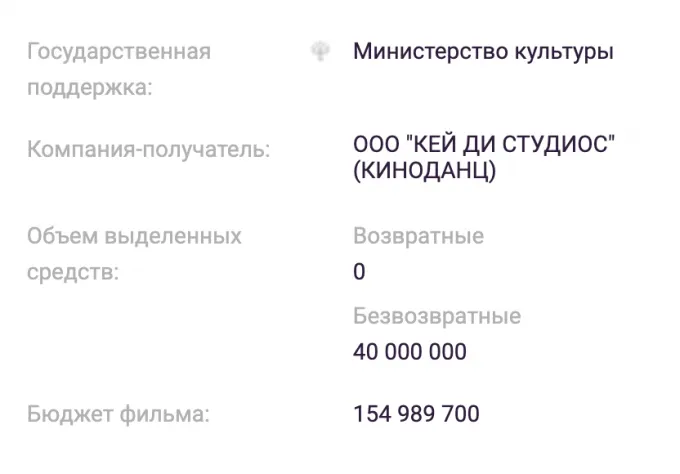 Фонд кино подал в суд на ООО «КЕЙ ДИ СТУДИОС» или компанию Kinodanz. Государство требует от фирмы выплатить 45 млн рублей, которые Kinodanz, скорее всего, профукала на бездарное кино.