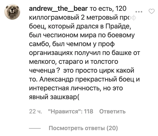 Понятно, что Саша не планировал убивать чеченского лидера, но подписчикам Емельяненко бой крайне не понравился. Самое мягкое замечание – от журналиста ТАСС Игоря Лазорина, который намекнул, что Александр дерётся не как профи.