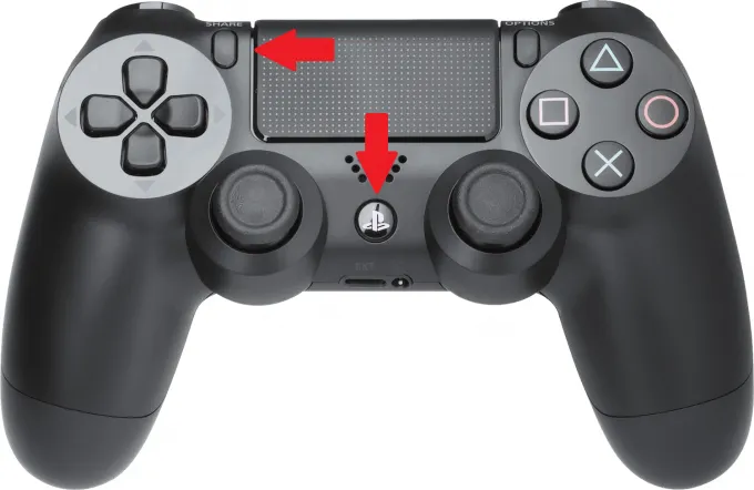 - На геймпаде одновременно зажмите кнопки Share и PS, и удерживайте их до тех пор, пока индикатор на задней панели не замигает белым цветом;