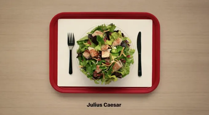 Дальше «Макдак» пофантазировал и представил обед древних знаменитостей и выдуманных персон. Юлий Цезарь ожидаемо заказал бы одноимённый салат, Марти Макфлай из «Назад в будущее» взял бы ретро-набор «Макдоналдса», Дракула зацепил бы тонну томатного соуса.