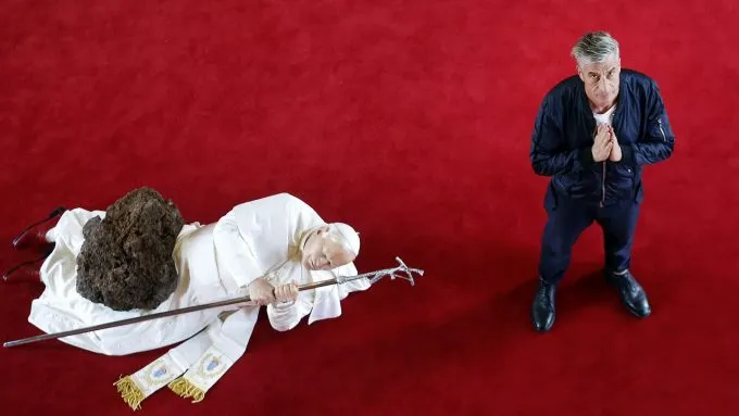 Это история о том, что крупные бабки ближе, чем вы думаете. Художник Маурицио Кателлан известен благодаря серии провокационных работ. Один из его шедевров — Папа Римский, ставший жертвой метеорита — появился в заставке сериала «Молодой папа».