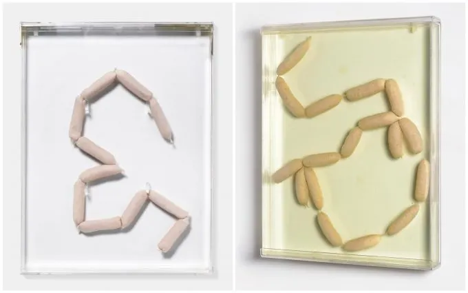 В 1993 году Дэмиэн разбавил гнетущую атмосферу своего творчества парой шуточных работ. Сначала он кинул в формалин одиннадцать обычных сосисок, а чуть позже повторил свой эксперимент, увеличив количество мясных изделий. В обоих случаях сосисоны уныло занимали рандомное положение в ящике. Но это не важно, ведь в 2016-м композицию Херста «17 сосисок» продали аж за 100 тысяч долларов