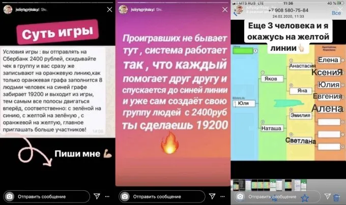 Судя по сториз и скриншотам в сети, организатор пирамиды предлагает участникам внести некую сумму на счёт в банке, например, 2400 рублей. Далее игрок показывает чек администратору, и тот записывает его в так называемую оранжевую линию.