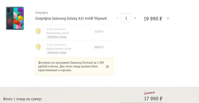 Например, сейчас в интернет-магазине «Билайна» можно заказать среднебюджетник за 17 990 рублей. Это легко сделать: добавляем товар в корзину, а при оформлении заказа вводим промокод SG2000. Это, кстати, касается и модификации с накопителем на 128 Гбайт — вводите код SG2300 и получаете соответствующую скидку.